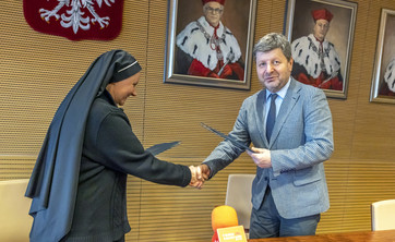 Rektor Politechniki Rzeszowskiej prof. Piotr Koszelnik i dyrektor Zespołu Szkół Ogólnokształcących im. Jana Pawła II Sióstr Prezentek s. mgr Agata Rozmus podpisali porozumienie o współpracy.
