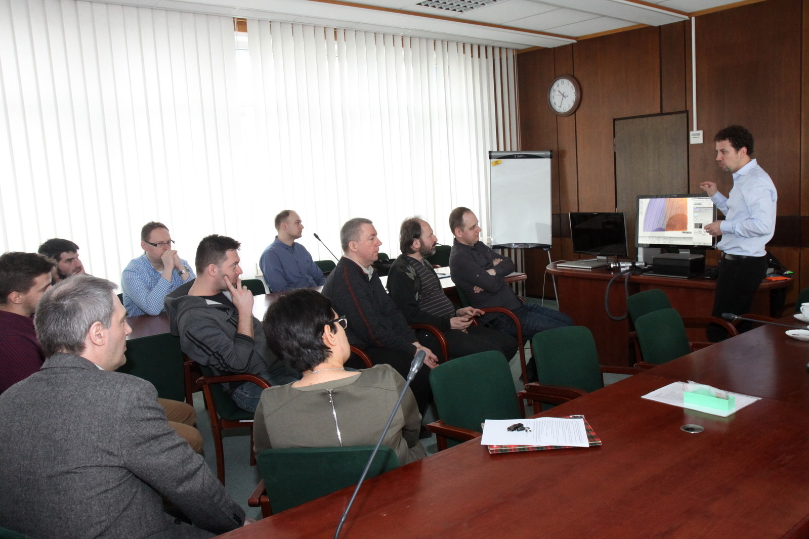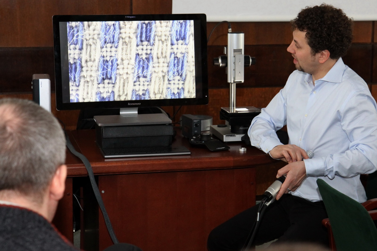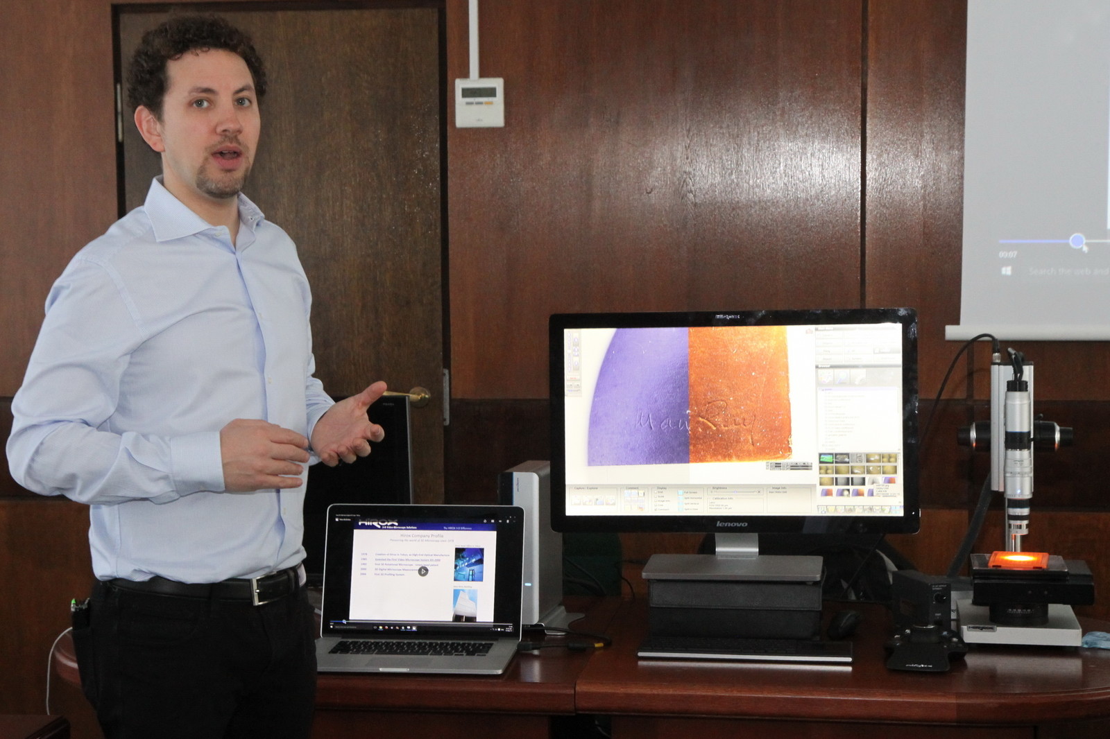 Spotkanie otworzył dr hab. inż. Jerzy Potencki, prof. PRz z Katedry Systemów Elektronicznych i Telekomunikacyjnych, zachęcając zebranych do wysłuchania i zapoznania się z możliwościami wielofunkcyjnego i najnowocześniejszego mikroskopu RH- 2000 3D Hirox. Prezentację poprowadzili Katarzyna Piekarska i Emilien Leonhardt z Hirox. Przybliżyli historię firmy oraz przedstawili zalety urządzenia: inspekcję na żywo zapisu filmów, tworzenie obrazu panoramicznego, kontrolę jakości, badanie powierzchni, dużą rozdzielczość. Mikroskop dokonuje m.in. pomiarów 2 i 3D oraz profilowania 3D, pomiaru powierzchni i objętości, łączenia obrazów 3D.