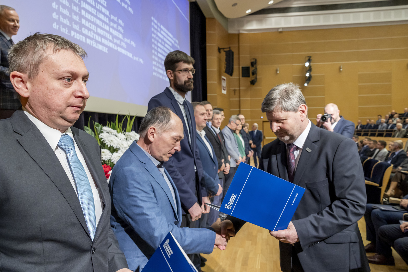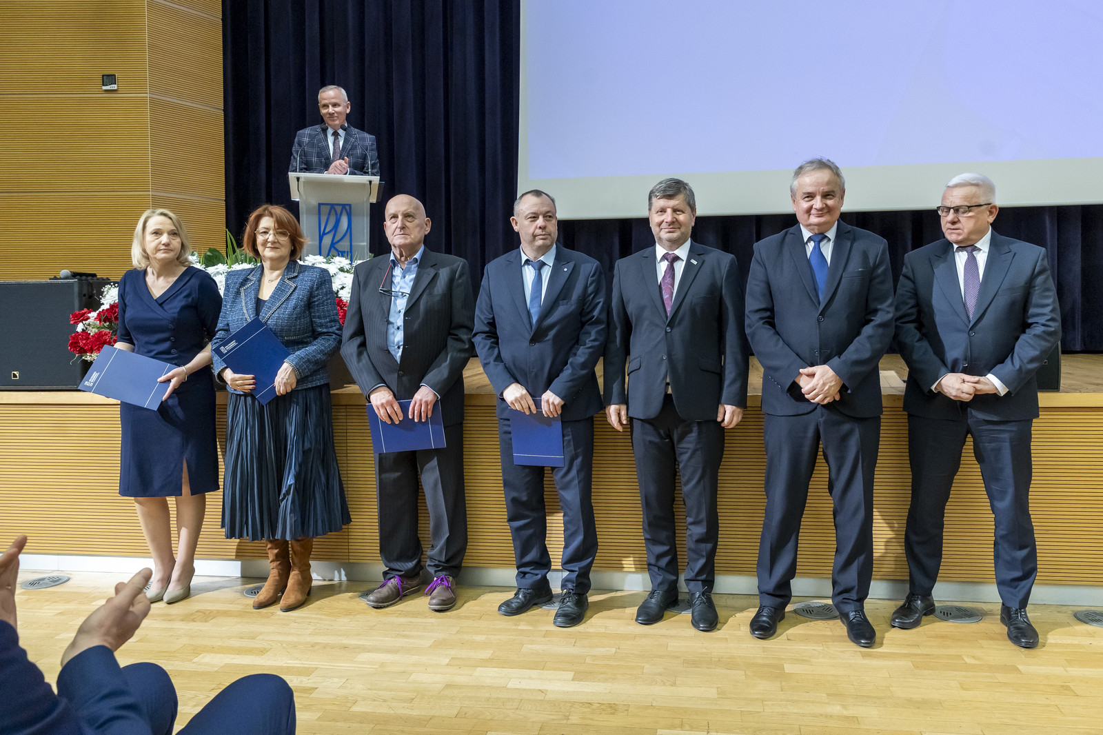 Uroczystość poprowadził prorektor ds. nauki dr hab. inż. Lesław Gniewek, prof. PRz. Dyplomy nagród wręczył rektor prof. dr hab. inż. Piotr Koszelnik. w towarzystwie dziekanów.